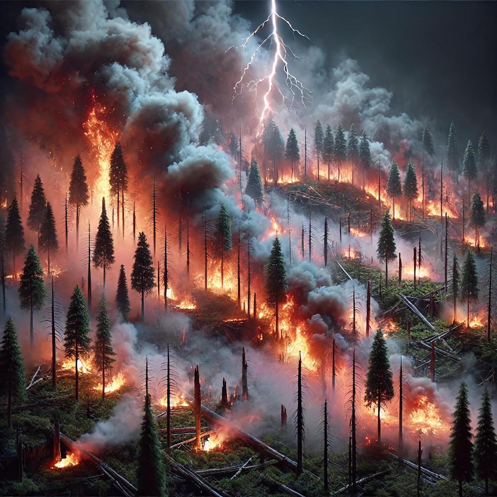 - 번개는 산불이나 건물 화재의 원인이 될 수 있습니다. 1988년 미국 옐로스톤 국립공원에서 발생한 대규모 산불은 번개로 인해 시작되었으며, 이로 인해 수백만 에이커의 숲이 소실되었습니다. 2017년 포르투갈에서도 번개로 인한 산불이 발생하여 60명 이상의 사망자가 발생했습니다.