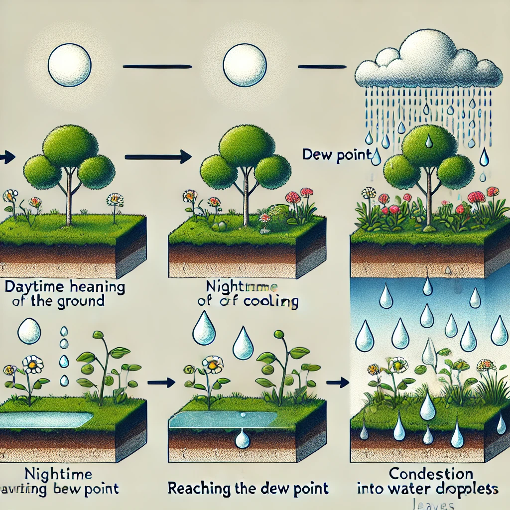 - 공기는 온도에 따라 수증기를 포함할 수 있는 양이 달라집니다. 특정 온도에서 공기가 포함할 수 있는 최대 수증기량을 '포화 상태'라고 하며, 이 때의 온도를 '이슬점'이라고 합니다. 밤 동안 기온이 이슬점까지 내려가면 공기 중의 수증기가 물방울로 응결합니다.