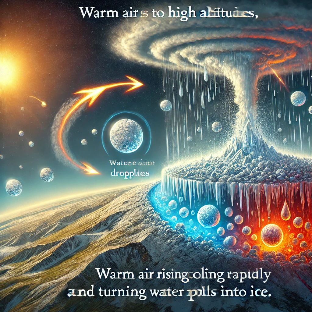 상승한 공기가 대기 중 높은 고도에 도달하면서 냉각됩니다. 이 과정에서 물방울이 얼어 우박으로 변합니다. 냉각이 충분히 일어나지 않으면 우박이 형성되지 않고 비로 내릴 수 있습니다. 높은 고도에서 공기는 더 차가워지며, 이러한 차가운 공기는 상승하는 따뜻한 공기를 만나면서 물방울을 얼려 우박을 형성합니다. 이 과정에서 우박의 크기와 모양이 결정되며, 강한 냉각은 더 큰 우박을 형성하게 합니다.